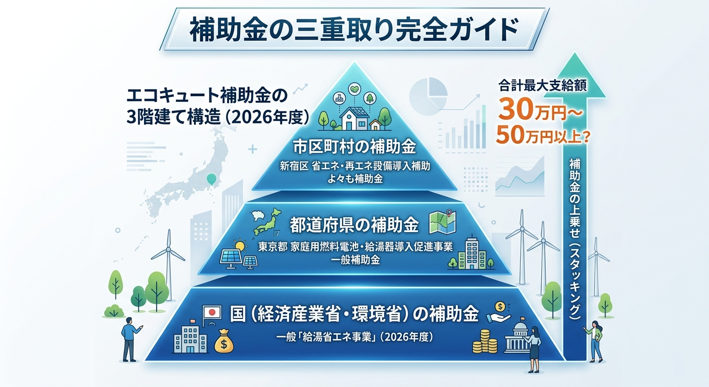 エコキュート補助金 国+都道府県+市で最大いくら重ねられる?
